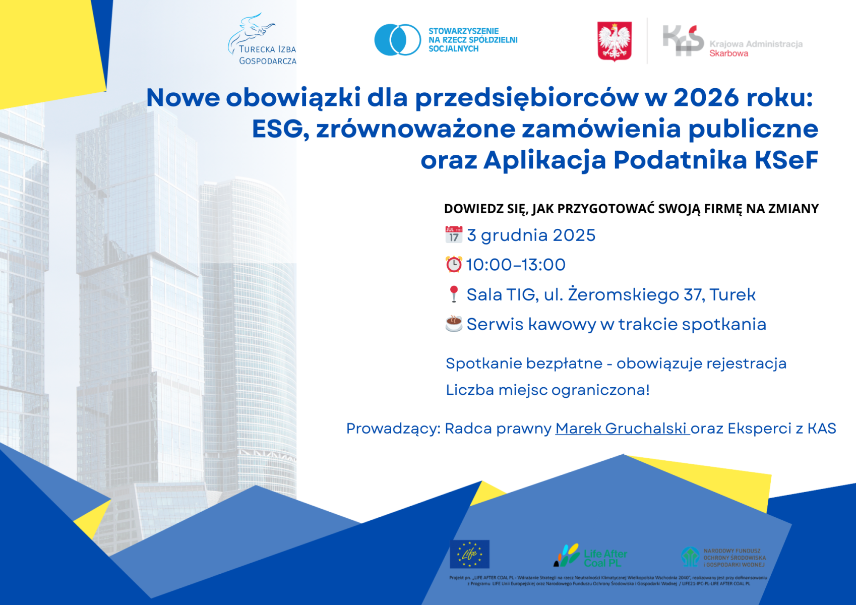 serdecznie zapraszamy do udziału w spotkaniu pt. „Nowe obowiązki dla przedsiębiorców w 2026 roku: ESG, zrównoważone zamówienia publiczne oraz Aplikacja Podatnika KSeF”, organizowanym we współpracy ze Stowarzyszeniem na Rzecz Spółdzielni Socjalnych oraz Naczelnikiem Urzędu Skarbowego w Turku.